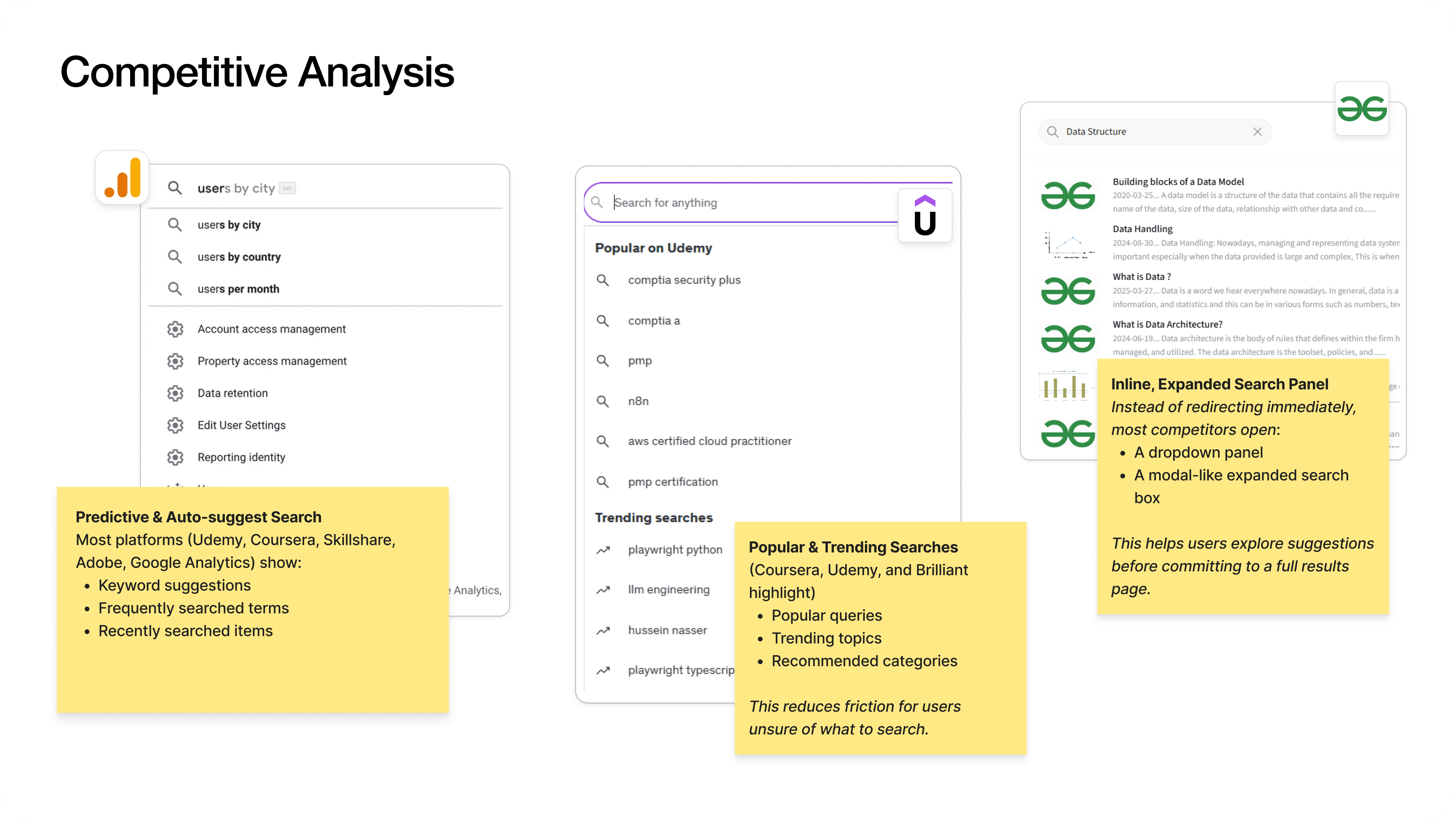 To design an efficient, user-friendly search feature, I conducted a competitive analysis of direct and indirect competitors. By studying common patterns, edge cases, and best practices across multiple platforms, I identified key insights to create a highly functional and effective search experience.